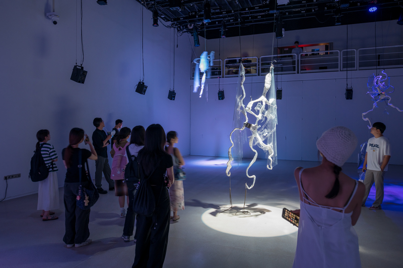 The artist used the projection of mirrors and the blocking of doors to both conceal and reveal the continuity and transience of an ever-flowing space, while translating waves of water, the texture of light, and the dispersal of fog into a performance of climax, tension, and emergence.