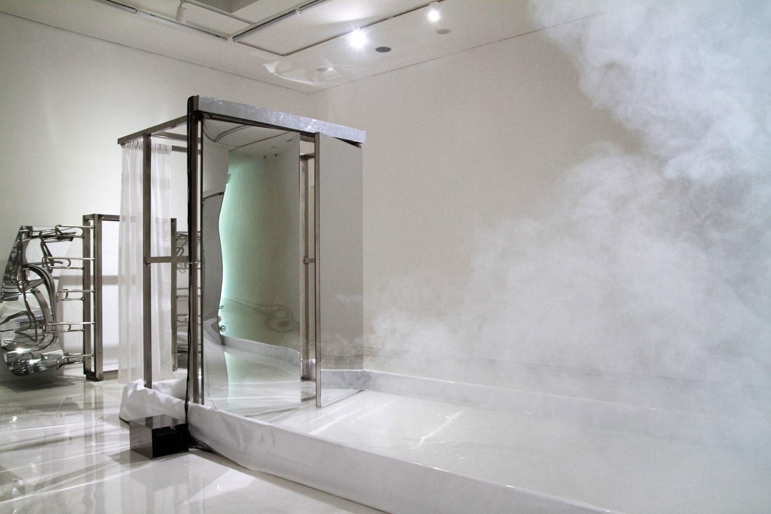 The work unfolds as a 30-minute performance structured around intersecting phases of introduction, build-up, climax, and subsidence. Two doors, their lower parts submerged in water, generate constant ripples within the tank. The movements of the massive stainless-steel doors, with their mirror-like gleaming surfaces, intertwine with the fog filling the exhibition hall and the shifting presence of the audience, stirring the entire space.