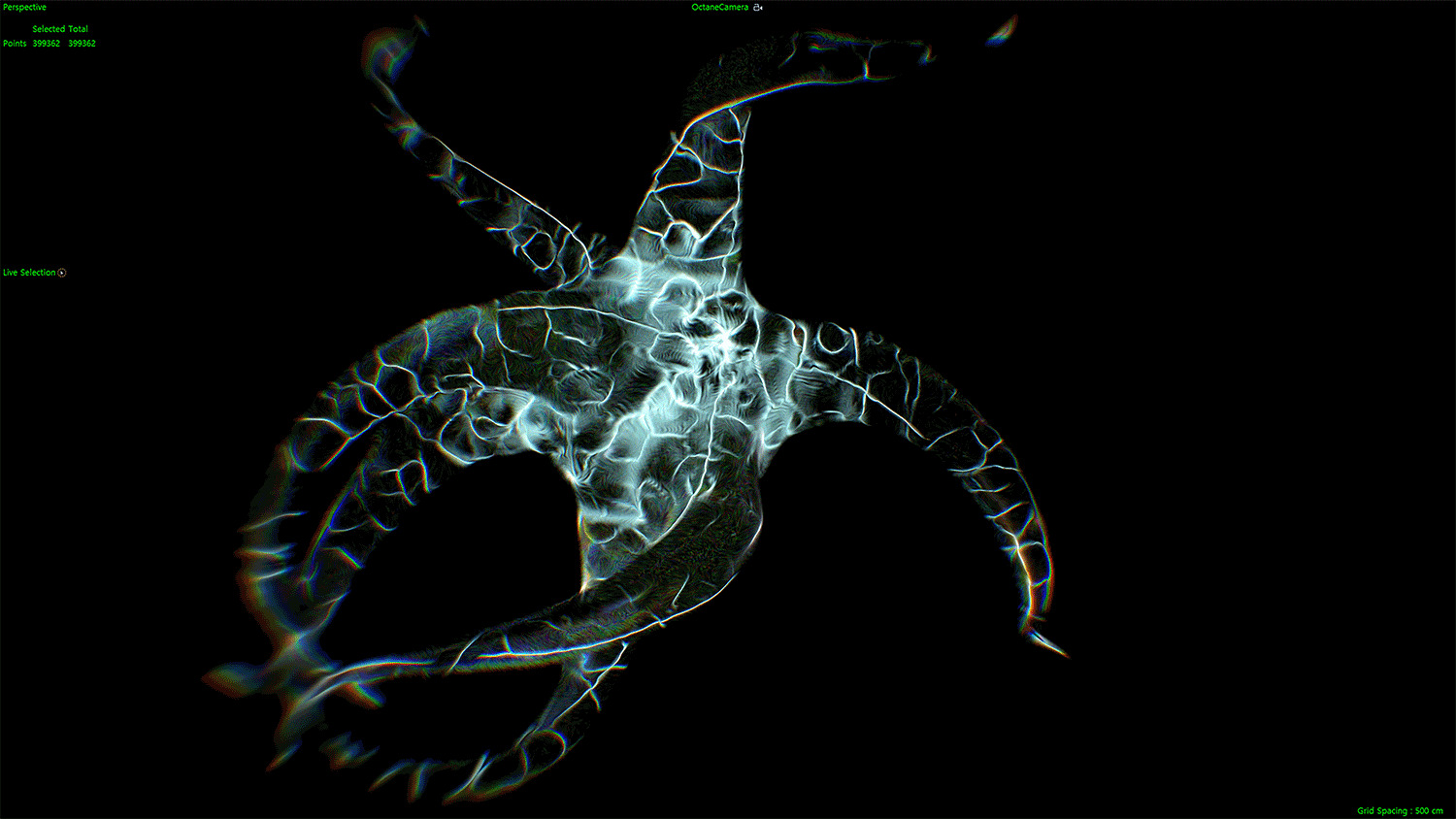 For example, her 2022 work Hyper-morphogenesis β is part of an exploration into the similarities between the forms of microbial ecosystems developed for minimal functionality and the immaterial worlds constructed through the virtual physics of 3D interfaces. The artist created physical environments within the software, then observed and documented the new species that emerged within the system.