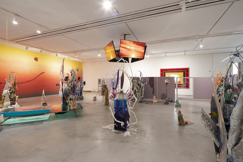 In between the walls of such posts, the small sculptures that take off from Choi’s works renewed themselves, enlarging into ‘vertebrates’ in human size. Finally, endlessly repeated in the center of the exhibition space are the video work NoticeRevelationLaunchClock (2020), which omnidirectionally sends out infinite digital images, and the sound work Horror Eros Vulgar Spell (2020).