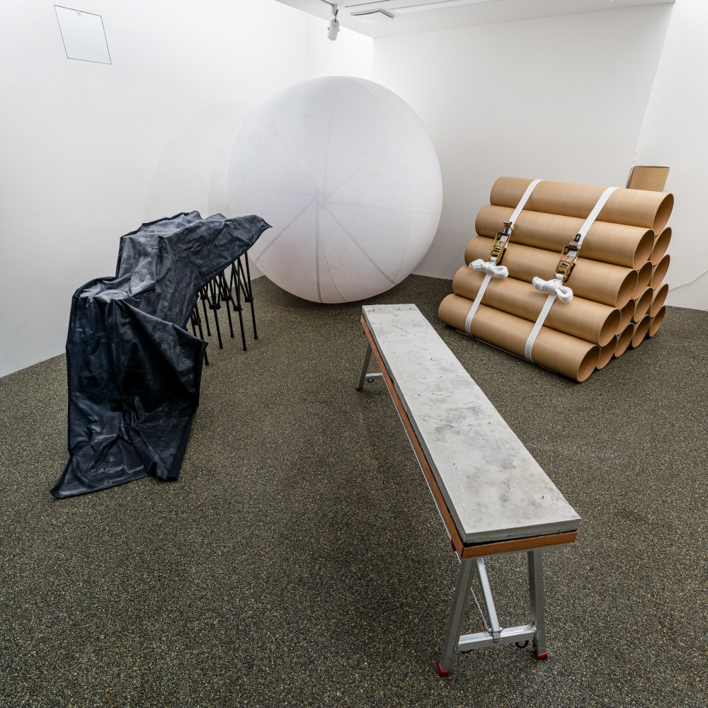 Objects were placed after precisely calculating the dimensions of the space and the distances between them, with careful consideration of material, size, and position. Light-looking brown cardboard tubes, stands resembling the color of cement and rebar, fabrics and bridges mimicking gray-toned roads, and smooth, opaque metal sheets—all materials familiar from the city—interacted atop the objects in this space, subtly misaligning with their conventional forms and colors.