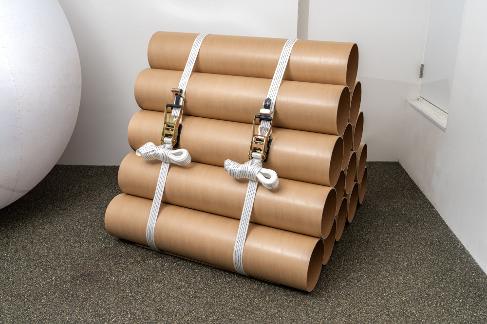 Jinseon Ahn, Bundle of Paper Pipe, 2023, Paper pipe, truck fixing belt, Dimensions variable (120 x 130 x 130 cm) ©Jinseon Ahn