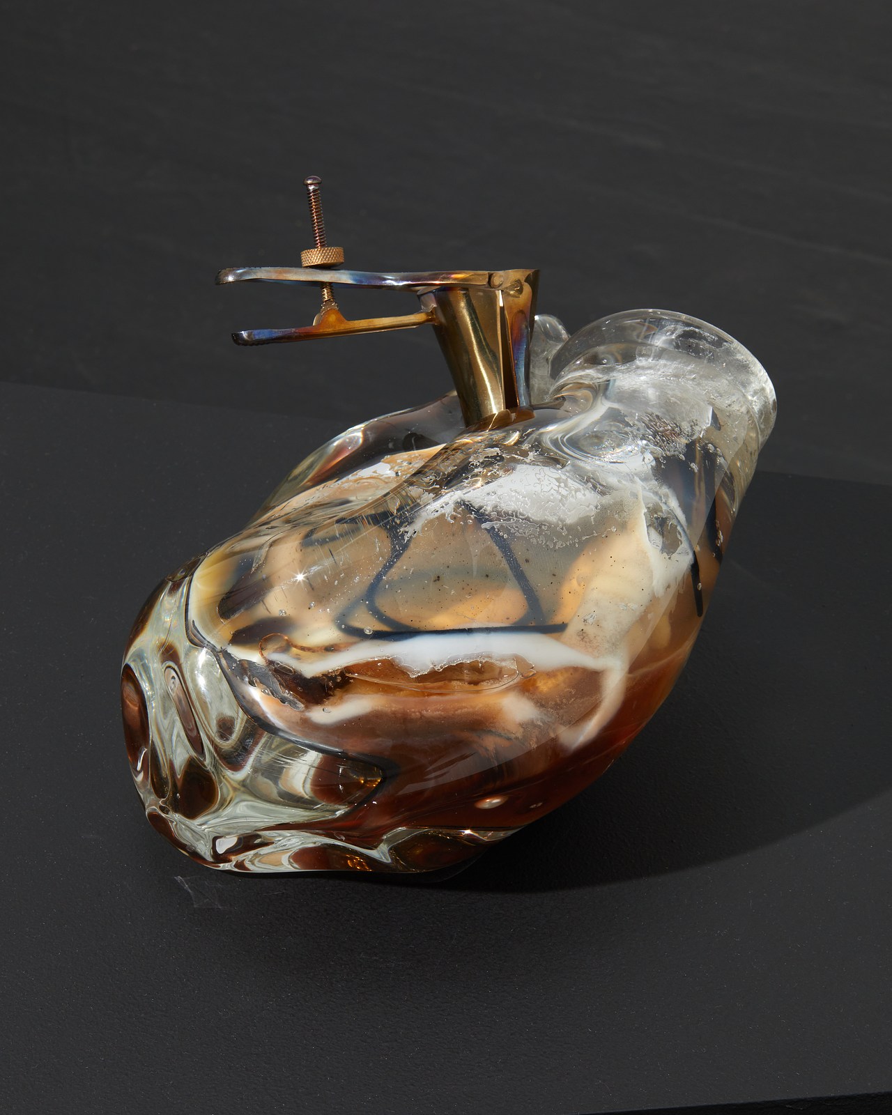 《Severance》 forges a narrative of subjugation while examining the implication of self-security through medicine and the history of non-consensual biomedical experiments. Yoo presents blown glass sculptures held ajar by surgical tools bracing an interior containing a wax sculpture submerged in liquid detergent. The sculptures are scattered on the floor that is painted to depict a chessboard pattern, identifying the imperfect entry of abstract strategy and false dilemma into an equation that weighs the odds of survival with ability of access.