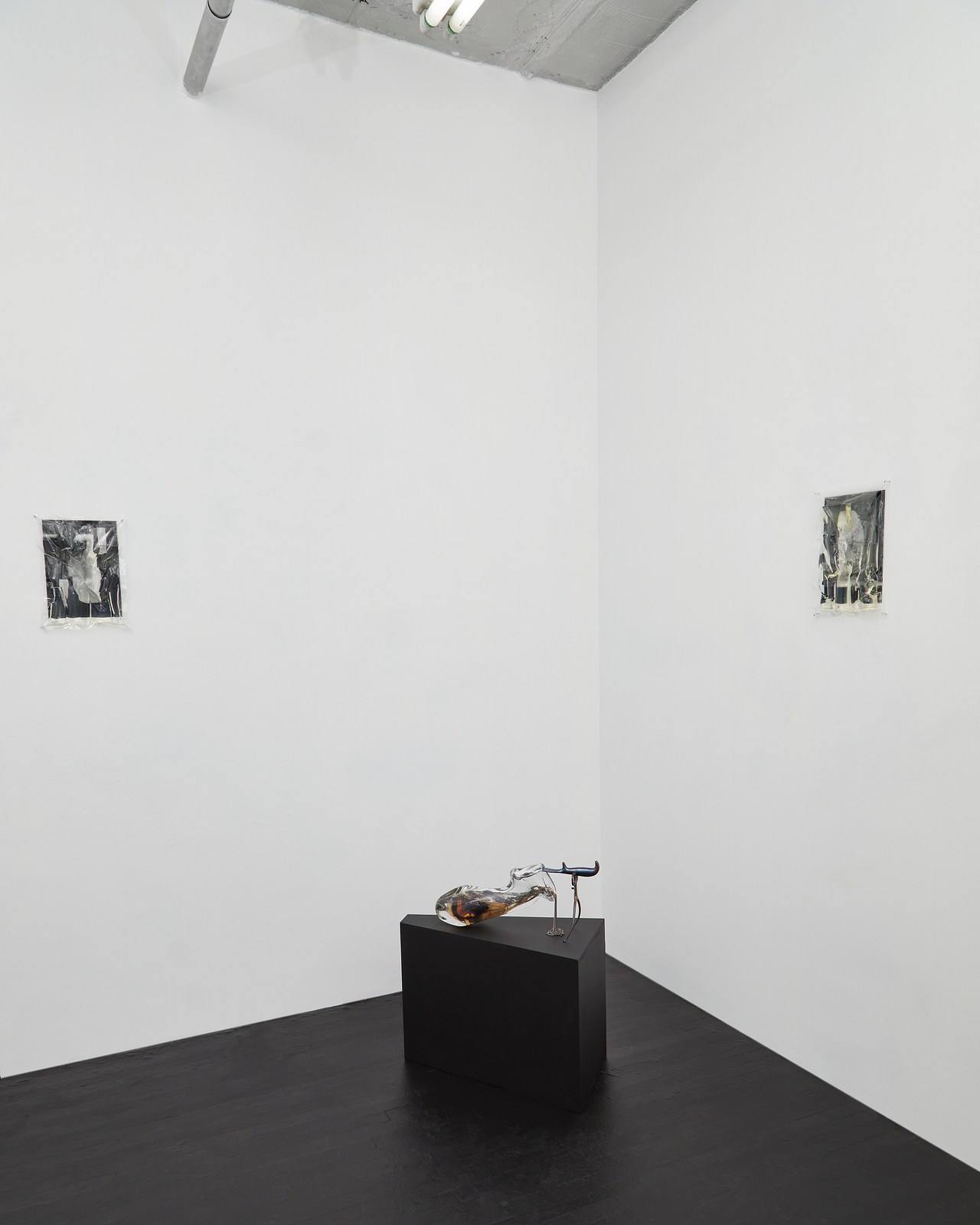 A vinyl sheath containing mixed liquid covers the sculptures, creating a curved reflection and ultimately distorting the image behind it. Fear of disease and of machines, often understood as partners in design and necessary to modern life, invoke the roots of perfectionism that appeal to the long and complex narrative of Westernization. To both fear and desire a potential solution to the body and its traumas complicates a personal surrender to systems that have benefited from the erasure of histories and bodies that have unknowingly and unwillingly built the dominant position of western medicine in the world.