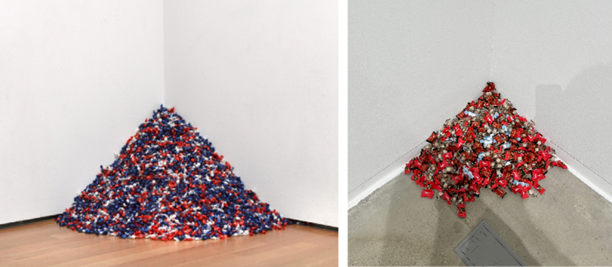 the work to disappear. The candies—red, blue, and silver—evoke the colors of