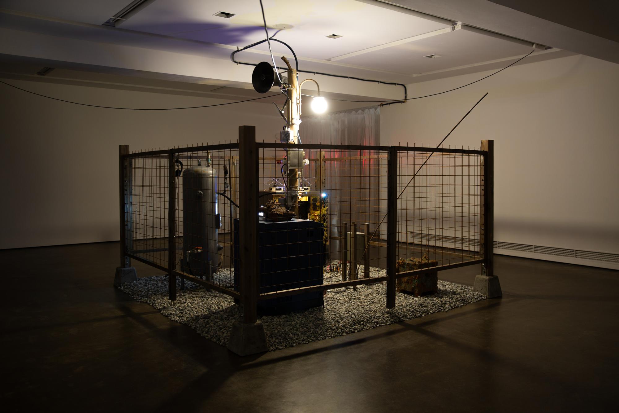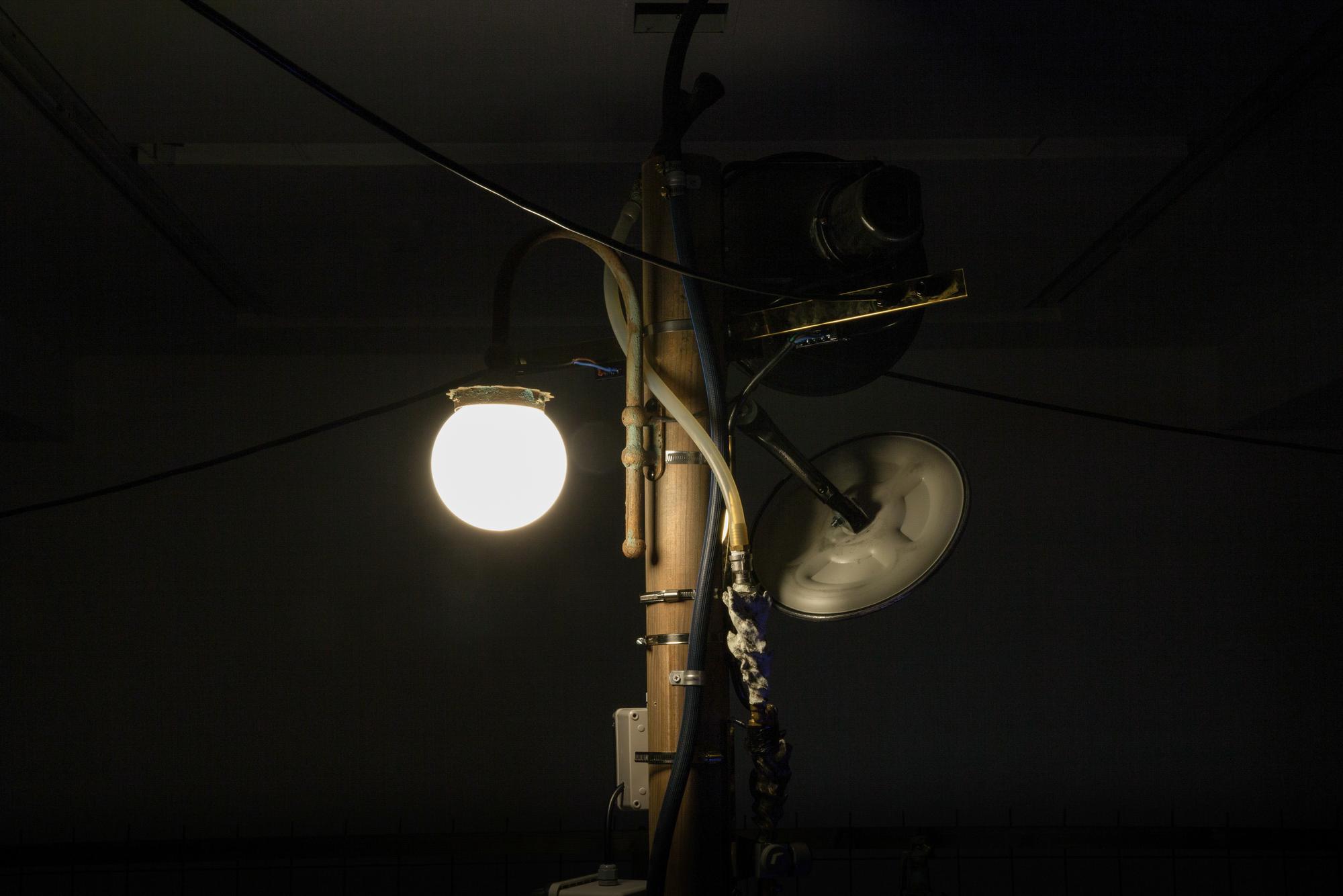 utility poles. The staging recalls hidden pipes behind walls, large tanks in