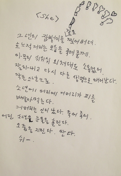 In 2005, 《echowords》 exhibition was held at One and J Gallery. In this exhibition, two series of ‘Text Landscape’ and ‘Text Play’ were presented. ‘echowords’ has a dictionary meaning of ‘words to imitate’ and is a representative term for his drawings made up of meaningless words such as onomatopoeia and mimic words.