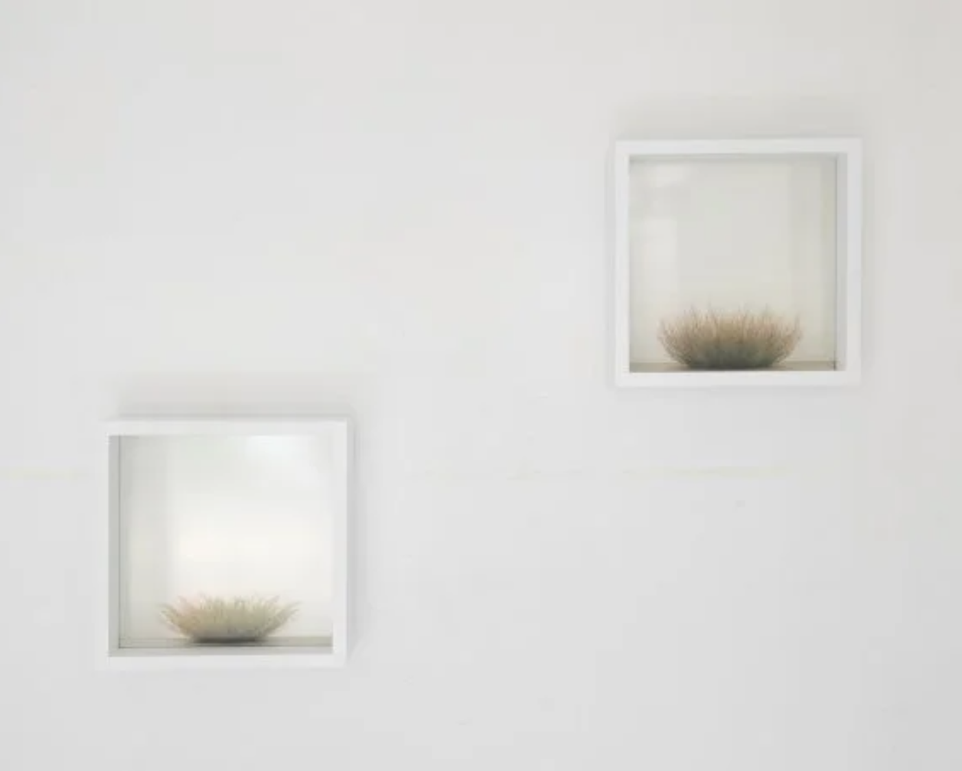 Through his representative ‘Tree’ series, Myoung Ho Lee previously gained attention by reversing the conventional approach of depicting trees. Instead of drawing trees, he installed a large white canvas behind real trees and photographed them, thereby illuminating and revealing the actual trees themselves. In this exhibition, he presents new works different from his previous practice. These are installation works layering printed images of small plants inside glass boxes. At first glance, the small plant images inside the glass boxes are not easily noticeable due to their size, but upon closer observation, they reveal their presence.