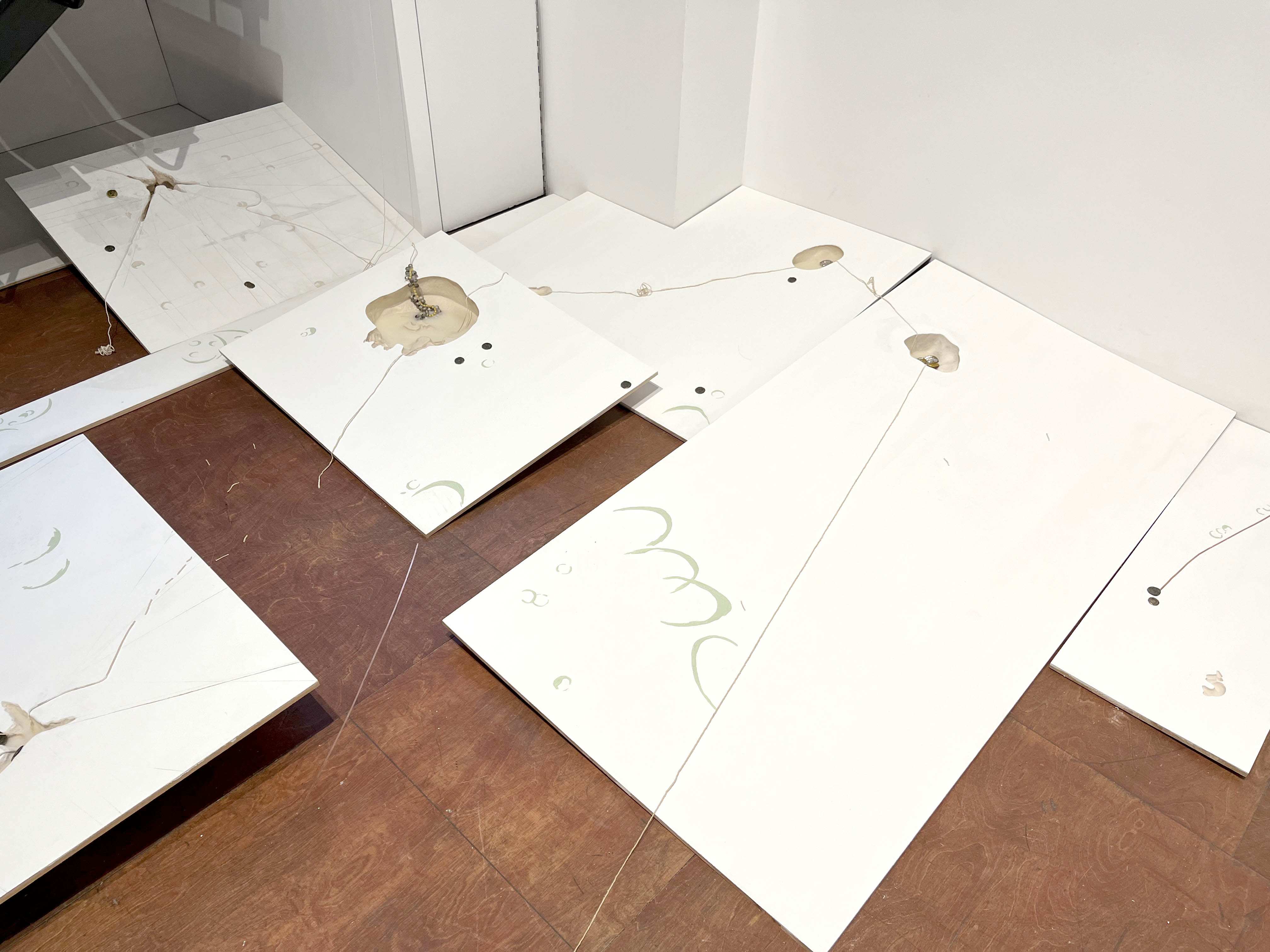 No, it does not necessarily require direct experience. Since it is a place of viewing, I considered a visually prioritized relationship. There are many ways to recall the sensation of impact from an image. For that reason, when expressing traces of movement, I pursued clumsy drawings rather than clear clues, and finishes that allow for imagined breakage rather than solid elasticity. In exhibitions like this, I am aware of the generosity that allows somewhat rough finishes. … I have always been deeply interested in rituals. I have experiences of spitting to find a path, connecting things that match, skipping the most precious object across water, sticking coins or spoons to rocks, or betting life and death on creatures like water beetles or hamsters treated as objects. (a bell rings) … The drawings are friends I have high expectations for, enough to call them the main element of this exhibition. I believe they embody this working method well.