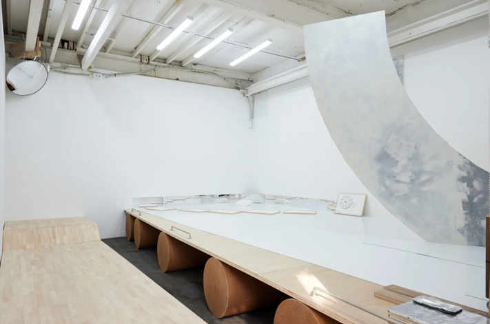 On the first floor, a rolling wheel following the scale of the building becomes the central element, embodying traces of compromise along the path of formation through its distinctive surface. This wheel is produced based on the formula for circumference, CNC (Computer Numerical Control) machining, and automotive painting processes, and during the exhibition period it functions as part of the space, taking on the role of a constituent element.