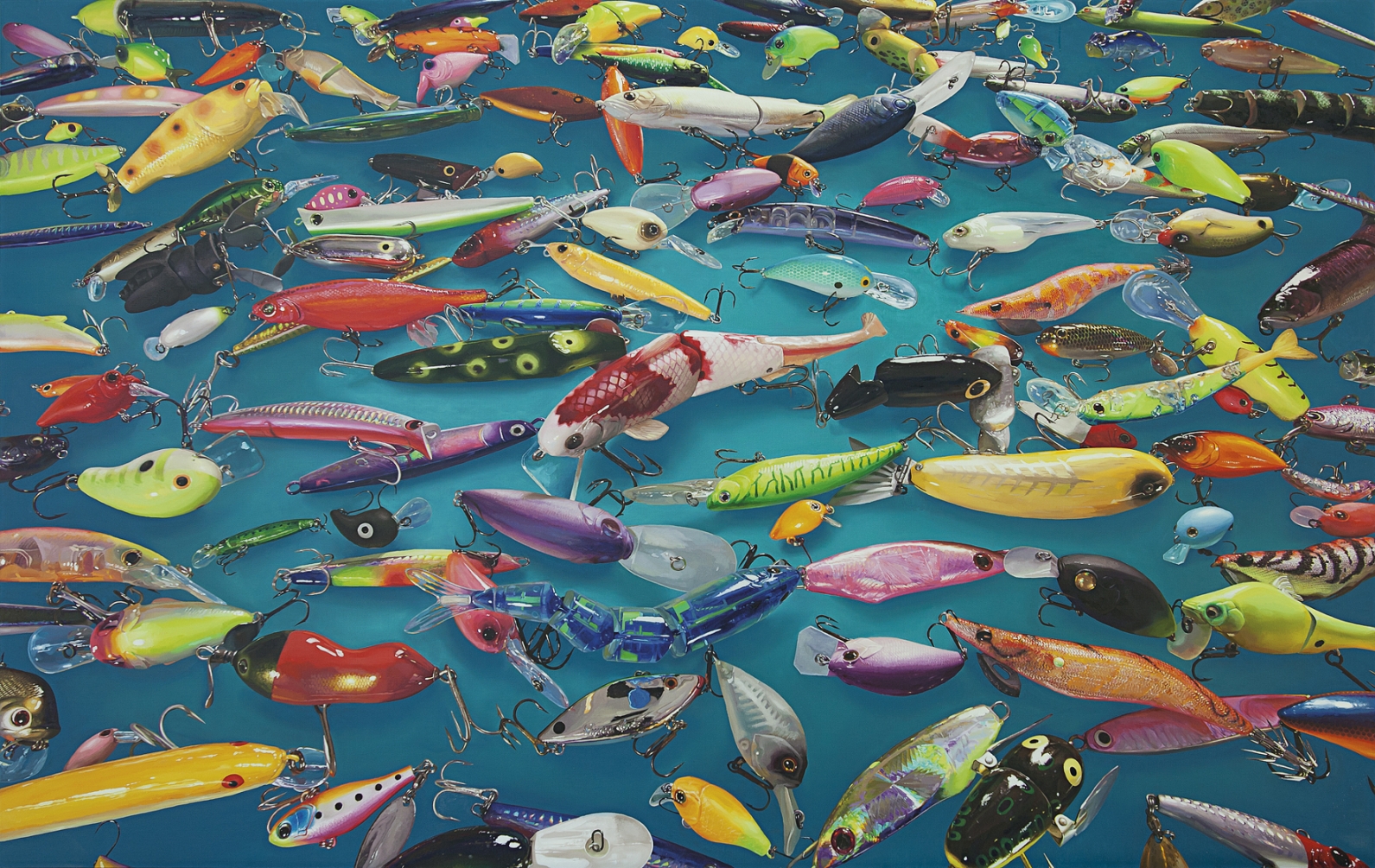 The Pieta series materializes existential contradictions through sculpture. The relationship between mold and doll, original and replica, addresses issues of life and technology, authenticity and reproduction. In the painting series Plastic Fish, the relationship between real fish and artificial bait, along with human intervention, presents survival as paradox. Even beyond video and installation, similar structural contradictions persist in painting and sculpture, revealing continuity across media.