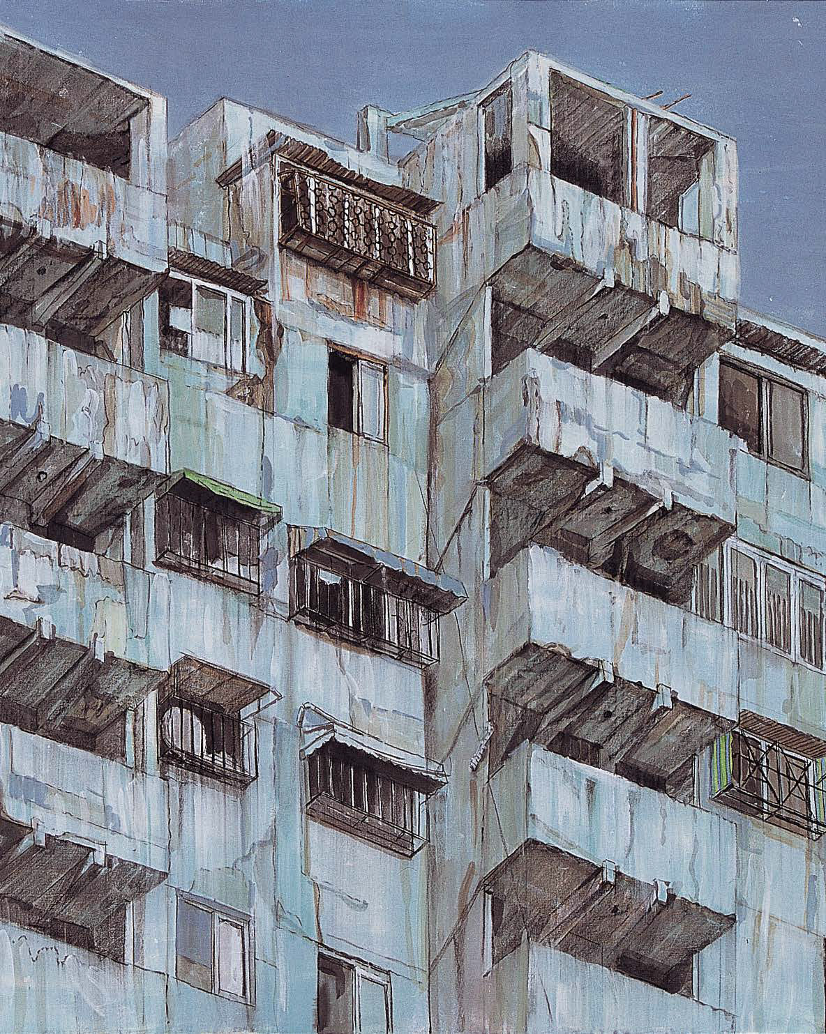 Jung’s paintings are characterized by meticulous, persistent realism. In early apartment works such as Cheongun-dong Monument and Geumhwa Citizen Apartment(2005), he employed a combination of hanji, ink, charcoal, and acrylic to precisely record stains, cracks, and signs of deterioration on building façades. The juxtaposition of traditional East Asian materials with Western painting media intensifies the fragile presence of architectural forms on the brink of disappearance.