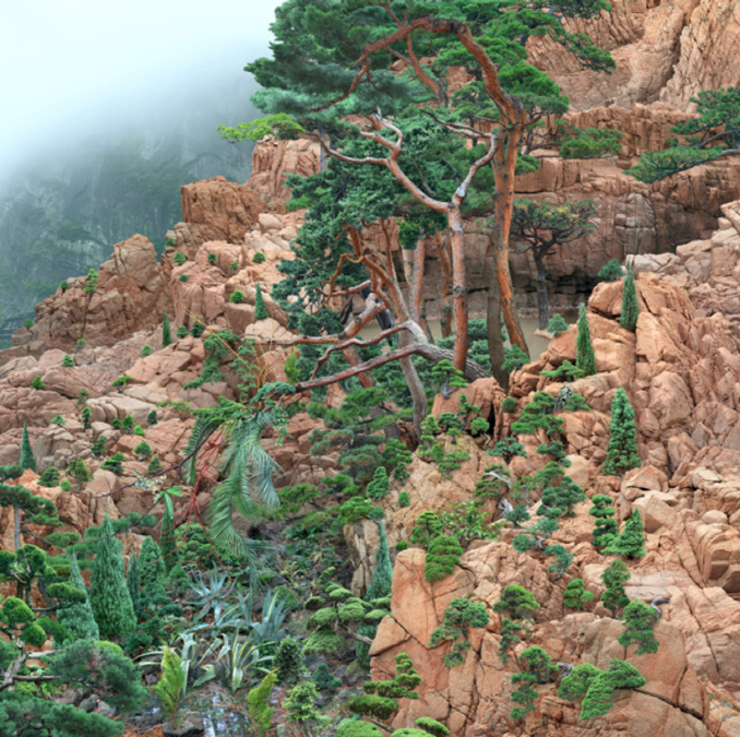 The distinct sense of estrangement in her compositions stems from technical decisions. Although based on real landscapes, the scenes are never taken in a single shot but stitched from many segments with slightly mismatched perspectives and vanishing points, producing “impossible landscapes.” The near absence of shadows flattens the image, yet within it coexist multiple times, seasons, elevations, and distances simultaneously. Tens of thousands of shots, thousands of selected elements, and thousands of hand-crafted layers—along with up to ten hours of daily labor—reinsert analog temporality and physicality into a digitally constructed medium. In this way, form and content are inseparable: as she describes, “it’s not the forest, but the story of each tree”—the forest in her work is not a natural sum, but a fabricated relationship formed by thousands of edited fragments.