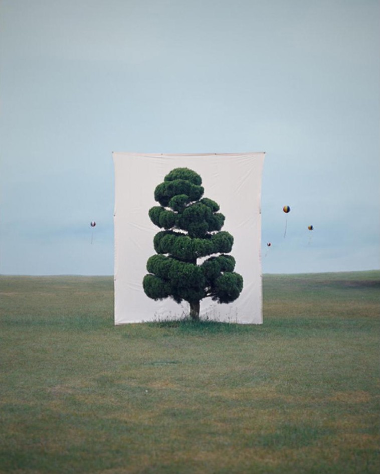 His seminal ‘Tree’ (2004–) series visualizes the act of revelation by placing a white canvas behind trees in nature, isolating them from their natural context. This simple yet profound gesture renders familiar landscapes unfamiliar, encouraging viewers to perceive the world anew. The subsequent ‘Mirage’ (2009–2011) series expands this notion of revelation into the realm of “reenactment,” transforming fragments of reality into another reality and exposing the illusory and fictional dimensions of art.
