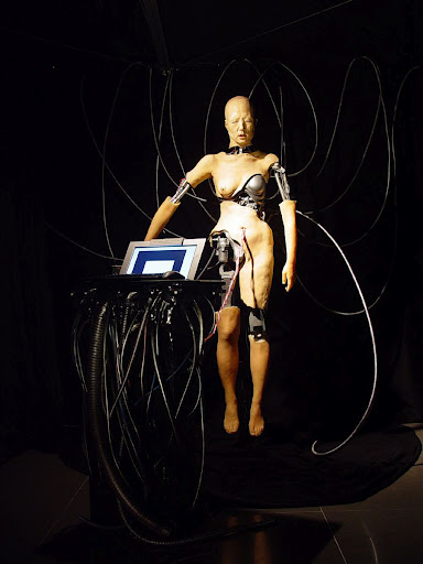 Jinah Rho’s artistic style has evolved by integrating traditional sculpture with new media, developing into interactive robotic forms that communicate directly with the audience. The early work You Type, I’ll Talk(2004) features a life-sized female cyborg that moves its eyes and mouth while interacting with the audience. Connected via a cord resembling an umbilical cord, the cyborg recognizes questions typed by the audience and responds verbally. This setup paradoxically illustrates the communication modes between machines and humans, highlighting how humans become mechanized while machines strive to become human.