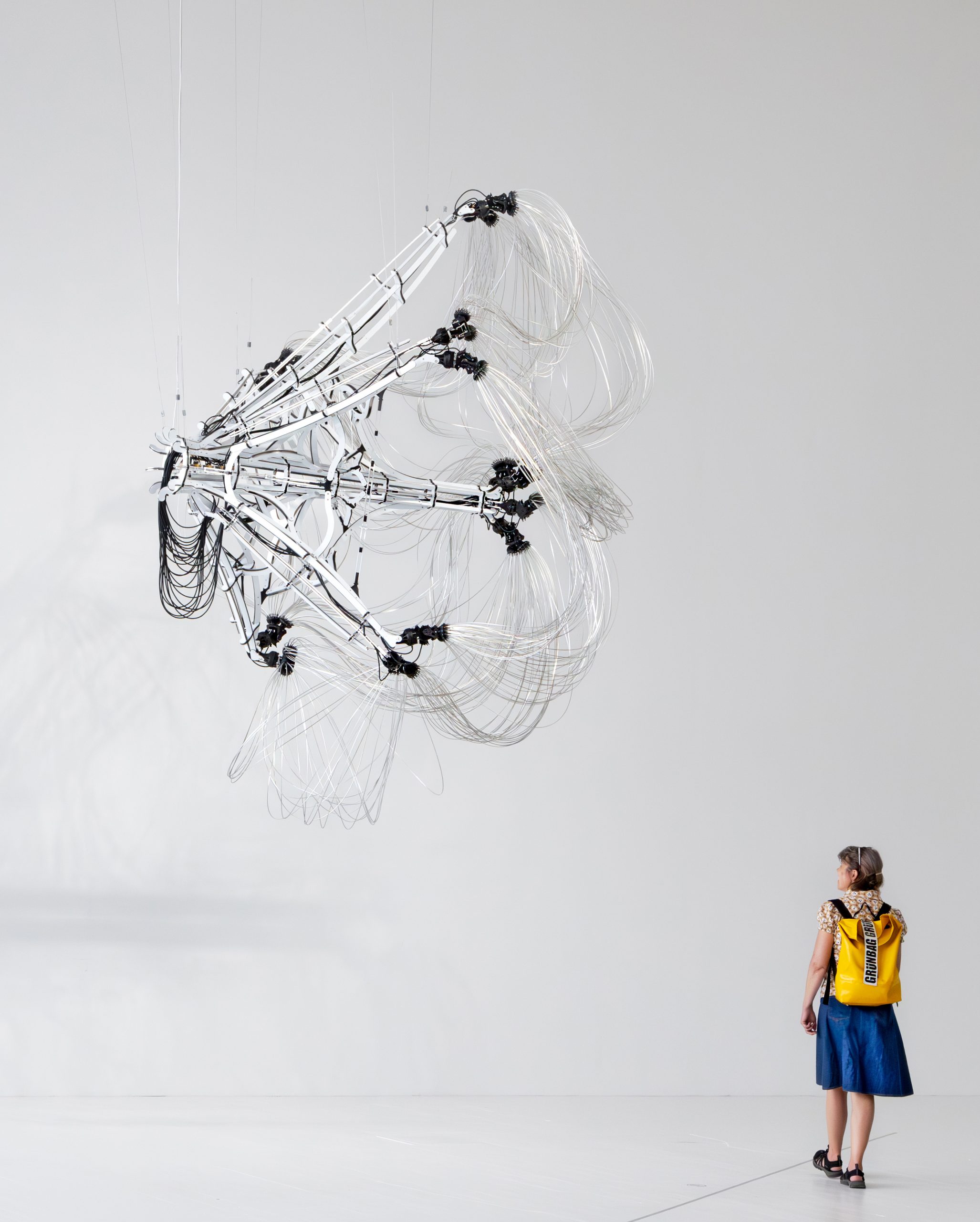 His representative CHROMA series (2012–) encapsulates these explorations in sculptural form. Works such as CHROMA V(2022) and CHROMA IX(2024) combine mathematical knot structures with fluid motion, visualizing the nonlinear order of material flow. Kim’s formal language achieves an aesthetic balance—both sensory and logical—at the intersection of technological structures, physical substances, and natural phenomena.