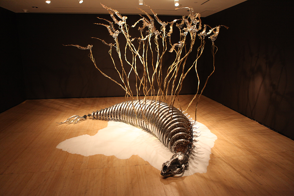 Opertus Lunula Umbra(2008), presented at the Liverpool Biennial in 2008, is a case where this worldview expands further. The artist posits a fictional institution, the United Research of Anima Machine (URAM), to endow the work with scientific and archaeological narratives and to transform the exhibition space into a record room of the institute. From this point, Choe’s work functions not merely as imagined life-forms but as devices that allegorize the ontological issues produced by human civilization and technological development.