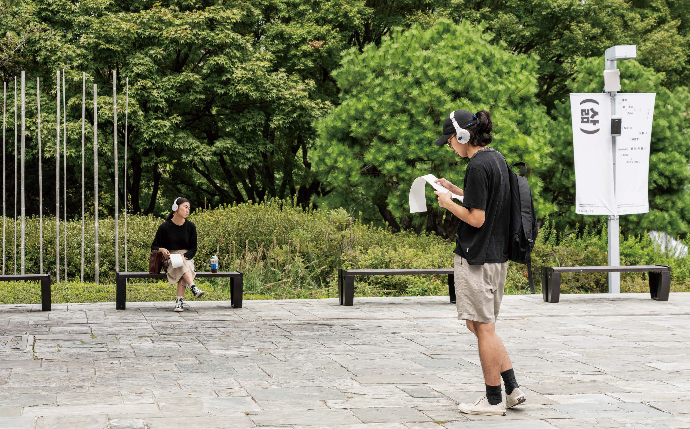 “Sound walk” is his signature way to turn specs into story. The ‘Forest of Subtle Truth’ series used LPS-based headphones to call zone-specific sounds; its extension, From Cheongju to Kyiv, expanded MMCA Cheongju’s plaza into “audio AR” via GPS-RTK and spatial audio mapping. Without screens, audiences steer “playback” by walking, turning, and tilting their heads—listening itself is the core procedure.