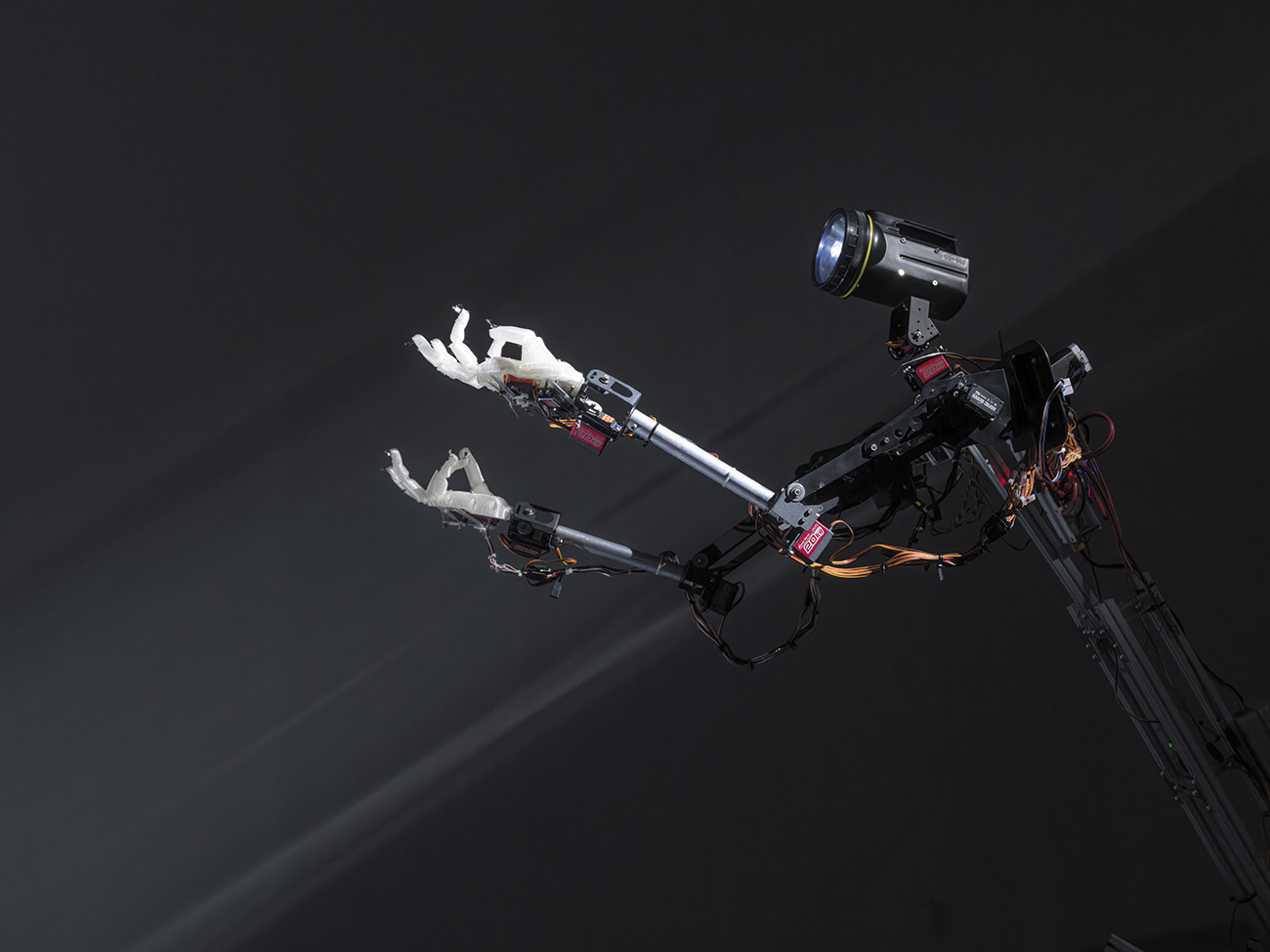 In the solo exhibition 《Club Golden Flower》(Alternative Space LOOP, 2018–2019), the one-armed “GF” robots appear as unfamiliar others and social mirrors. When they cast light toward one another so two shadows meet and become “two arms,” lack is symbolically completed by solidarity.