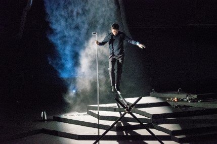 Robot theater forms a second axis. In 《Club Golden Flower》, robots assembled from tripods, ladders, and flashlights flood the stage with the material interplay of light, shadow, and motion. In Lyrics of Cheap Android 2 (Robot Nocturne) and Robot Crossing a Single Line Bridge, lighting, sound, and machine blocking are theatrically refined, yet the robots’ movements stay purposefully inefficient and awkward—formally refusing efficiency becomes the work’s content.