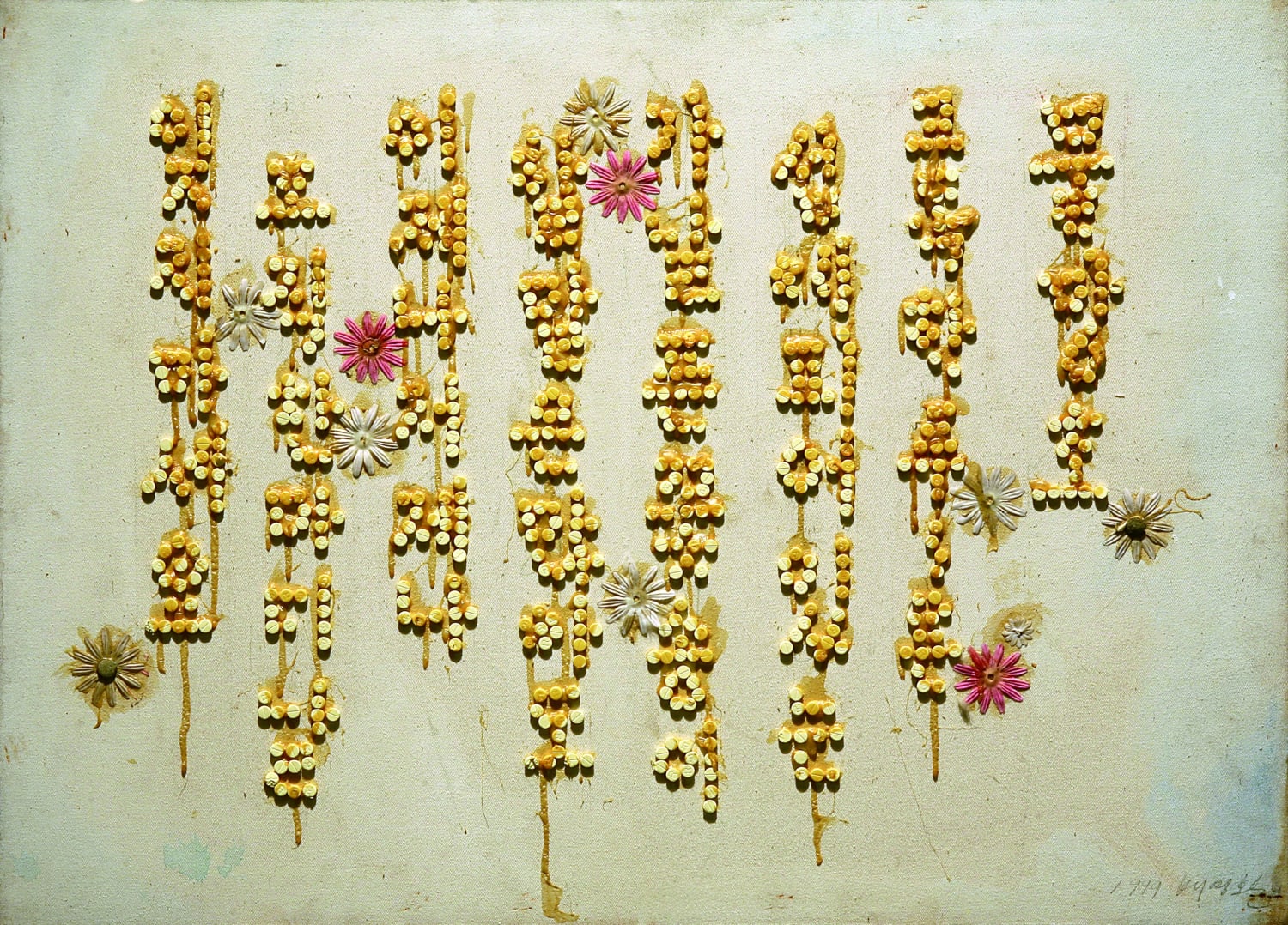 Pills(Expectorant), insudtrial glue, artificial flowers on canvas