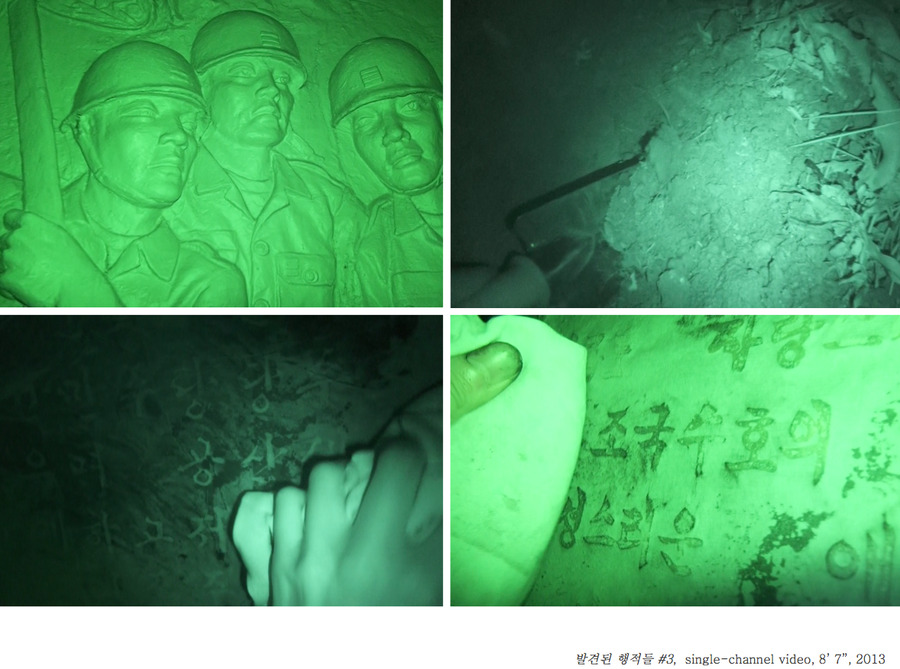 In Uncovered Trace, he enhances his practice of observation, collection, and re-editing by overlaying meaning onto mundane objects and places. In the following A Song Written in Okryuche, he emphasizes the ideological nature of language through visual coding (specific typefaces) and manipulation of K-pop lyrics, reconstructing the everyday through image editing to make it unfamiliar.