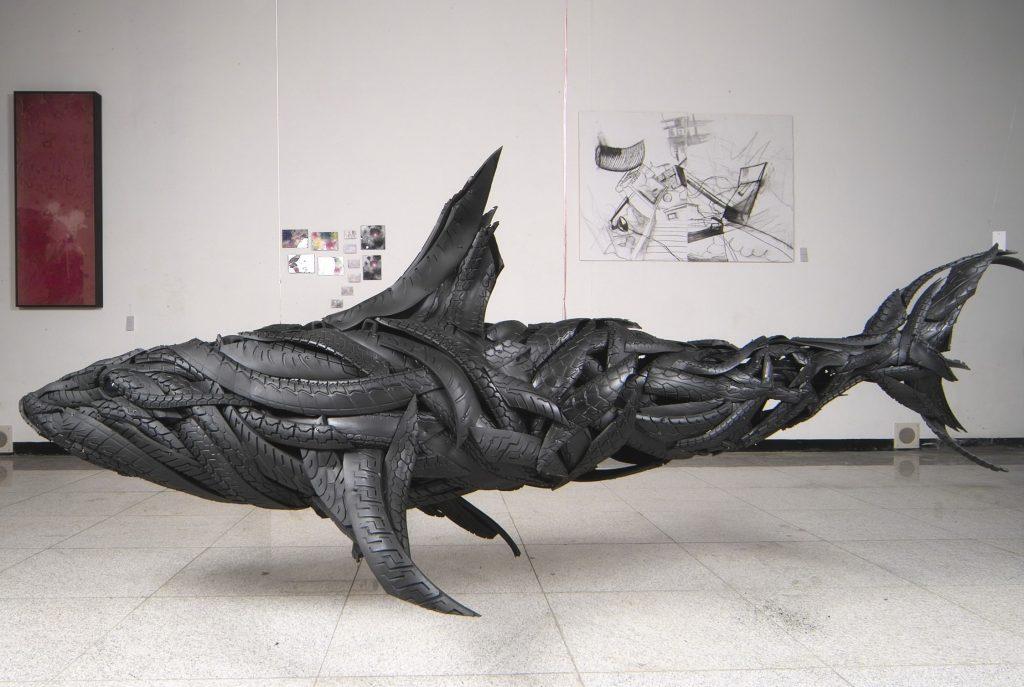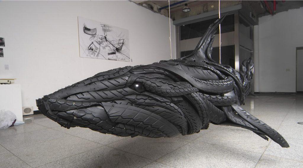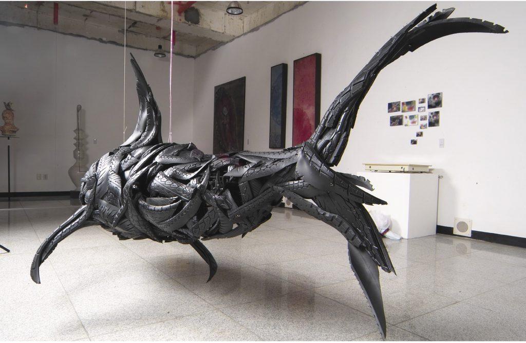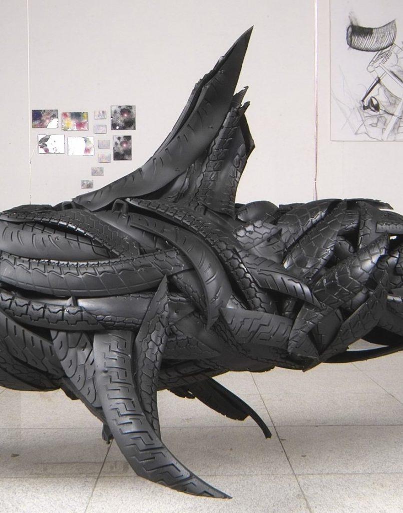 ‘Tire Mutant’ is created with worn-out rubber tires, cut and pasted on a prefabricated frame with iron or wood to finish the sculpture shape. After the process, they build up a casting model.