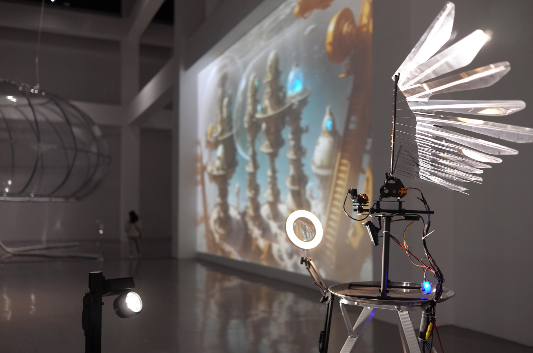 Her recent work Young Bird Care Center (2023) has evolved into a complex multimedia piece incorporating kinetic installation, sound art, and robotic drones. For the artist, technology is no longer an object of perception but redefined as a medium for ecological interaction. The reconfiguration of sensory experience expands beyond the visual to include auditory, olfactory, and spatial perception.
