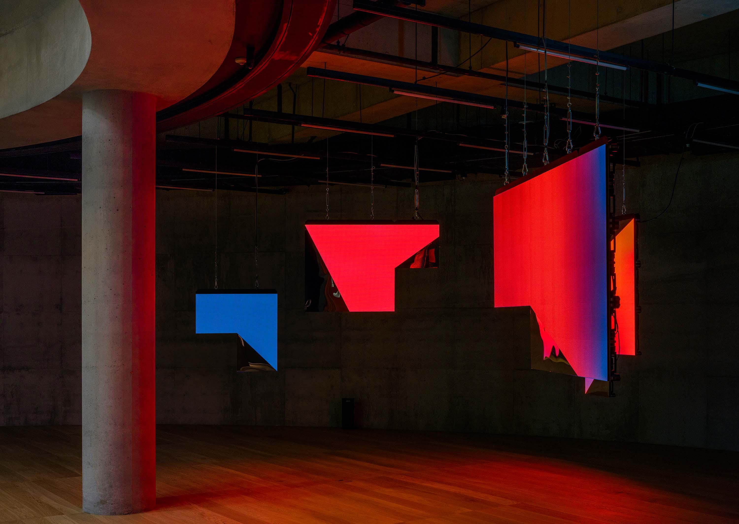 In Ghost Wall, Kwon utilized video imagery, shattered glass patterns, red light, and sound to construct immersive environments, where the material medium of media and its illusory images intersect and destabilize one another. The TV, once a passive receiver, is transformed into a sculptural performer, dominating the surrounding space.