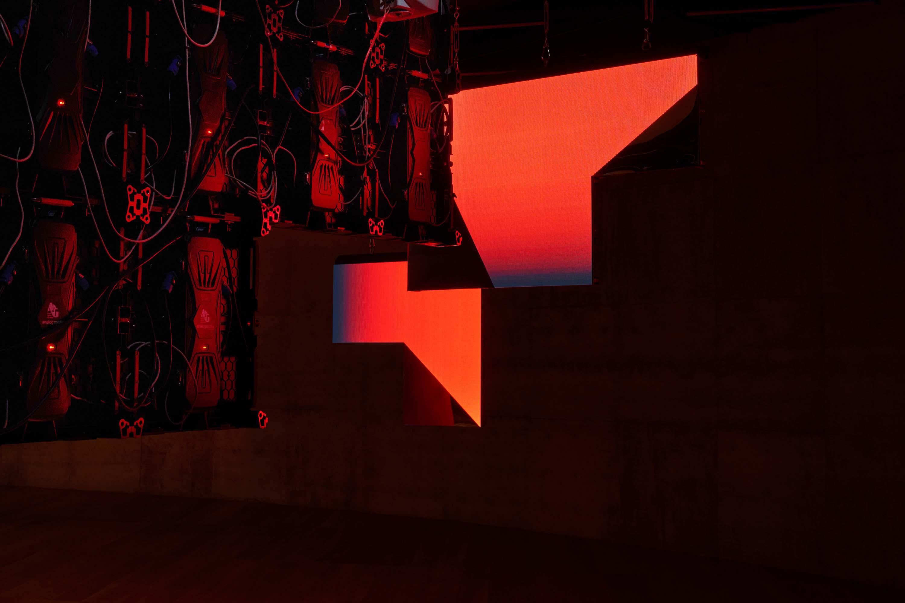 Since 2021, Kwon’s formal experiments have expanded into spatial installations symbolizing the overheated structures of techno-capitalism through the full adoption of LED panels. In Walls (2021, 2024), fragmented LED screens suspended in the air, along with acrylic mirrors and sound noise, visualize the accelerated cycle of production and consumption. In 《Fever Eye》, LED panels, six-channel video, and spatial soundscapes are used to construct hallucinatory liminal spaces where the interior and exterior of the screen merge, creating distorted perception and sensory instability.