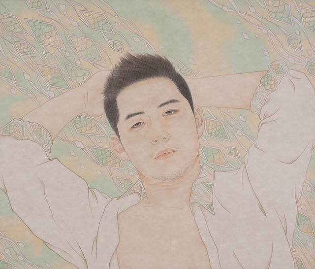 Grim Park’s work begins by combining the refined techniques of Korean Buddhist painting with contemporary narratives. In his early ‘Hwarangdo’ series, he visualized queer desire through idealized nude portraits of men painted on silk using Goryeo Buddhist techniques such as Yukrimunbeop. The labor-intensive method of layering pigment dozens of times on silk served as a metaphor for the painful effort required to attain beauty.