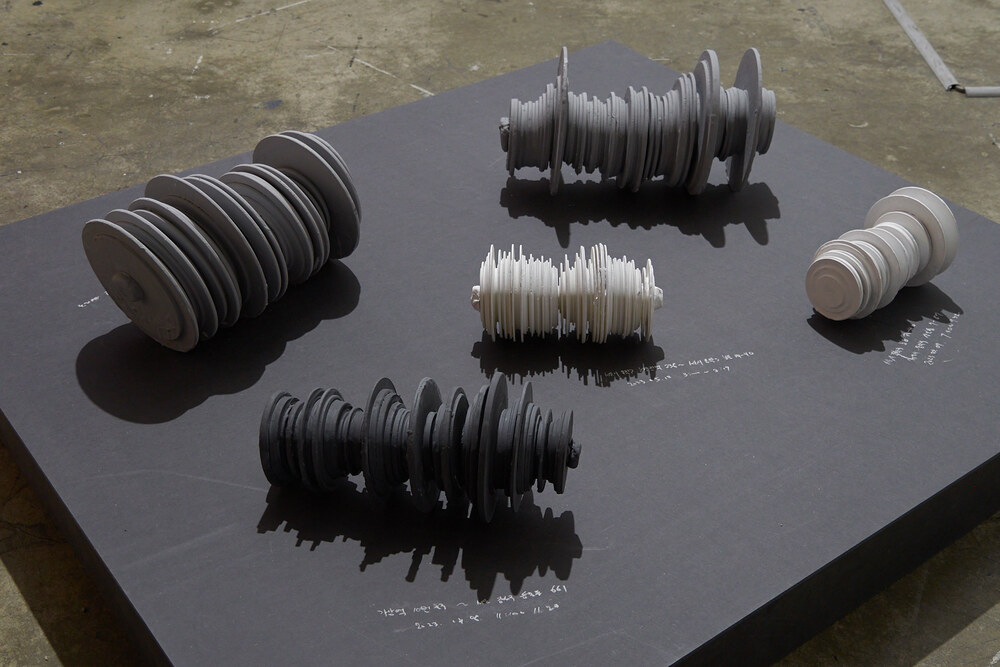 In her solo exhibition at Alternative Space LOOP in 2023, the large-scale sculptural installation Mass Action converted daily routines of 64 individuals into inflated balloon forms, translating immaterial time into measurable volume. In the same exhibition, Shape of Heard (2023) transformed collected footstep sounds into 3D-printed objects, crossing boundaries between auditory, visual, and tactile perception. These works demonstrate Jeong’s commitment to visualizing invisible routines by expanding sensory experience.