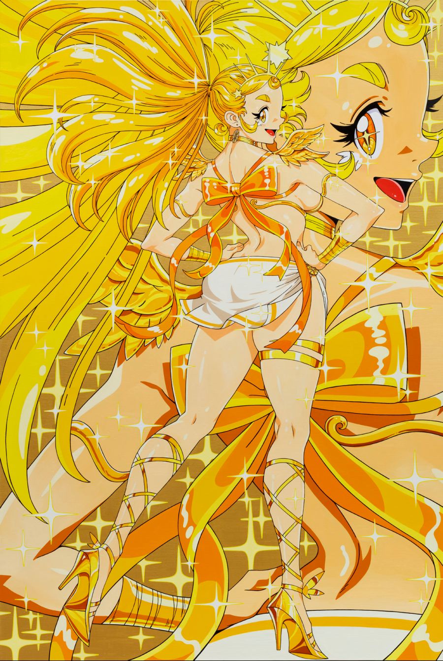 Lee Yunsung’s paintings instantly capture the audience’s attention with a background of glorious colours and patterns, such as a nude girl character with cute and delightful expression in a symbolization (moeka[萌え化]).