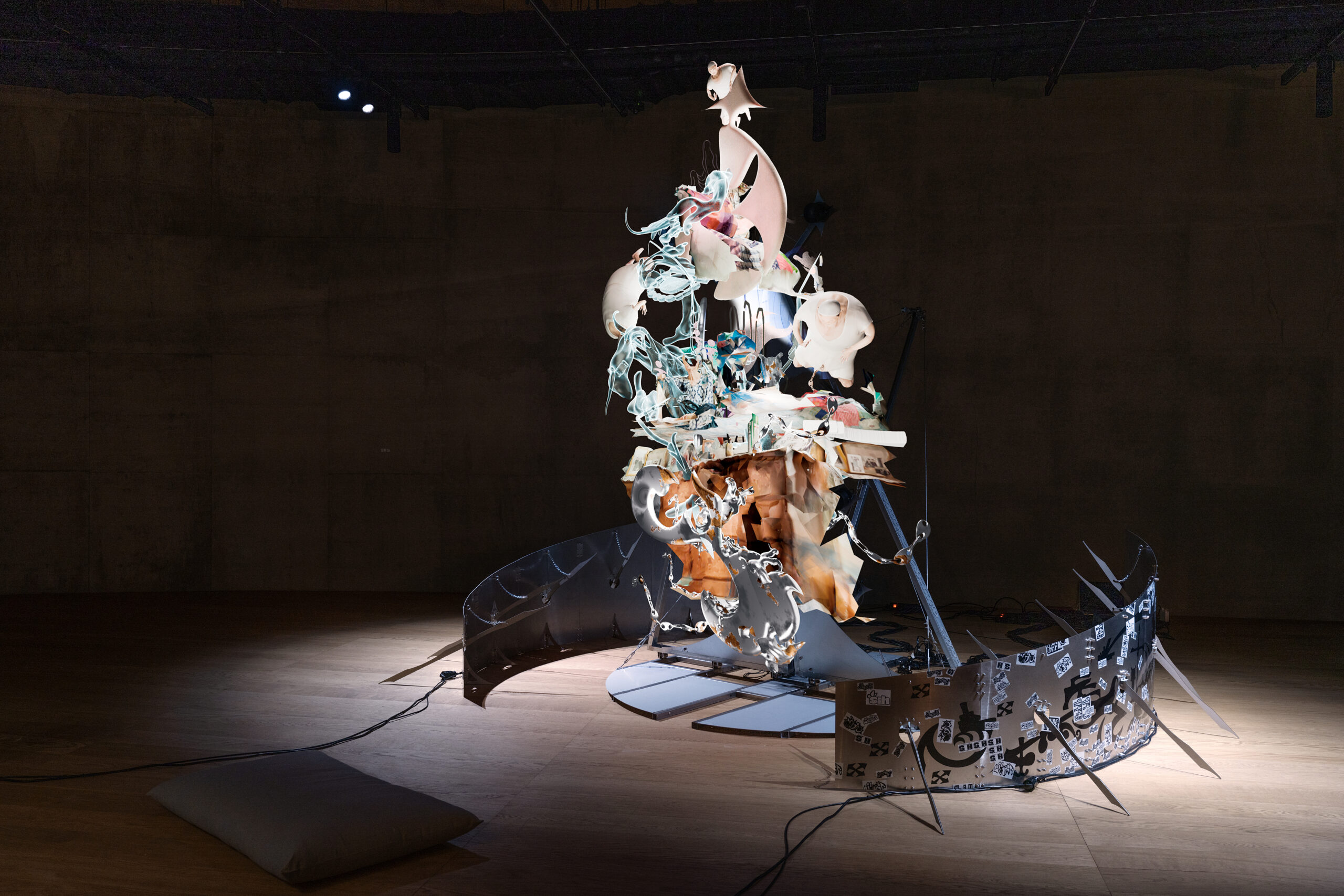 Within the ‘Shininho’ series, hologram fans, 3D scans, wood-pillar sculptures (modular building materials), and soundscape/text connect to construct the symbolic field of a ship’s hold/dock (Shininho World Tour(SONGEUN, 2024); 《Shininho Docking》(RIP Space, 2025)). The media façade Plastic Glitter Ending(2023) harnesses The Hyundai Seoul’s large public screen as a stage for narrative expansion.