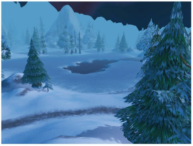 The in-game landscapes, captured from a monitor, are greatly enlarged and blurred, rendering their subjects indistinguishable. These transformed images appear entirely different from what he initially encountered. Although the game world is at its busiest in the early hours of the morning, the scenes in his photographs are devoid of any presence, presenting instead an empty and desolate landscape.