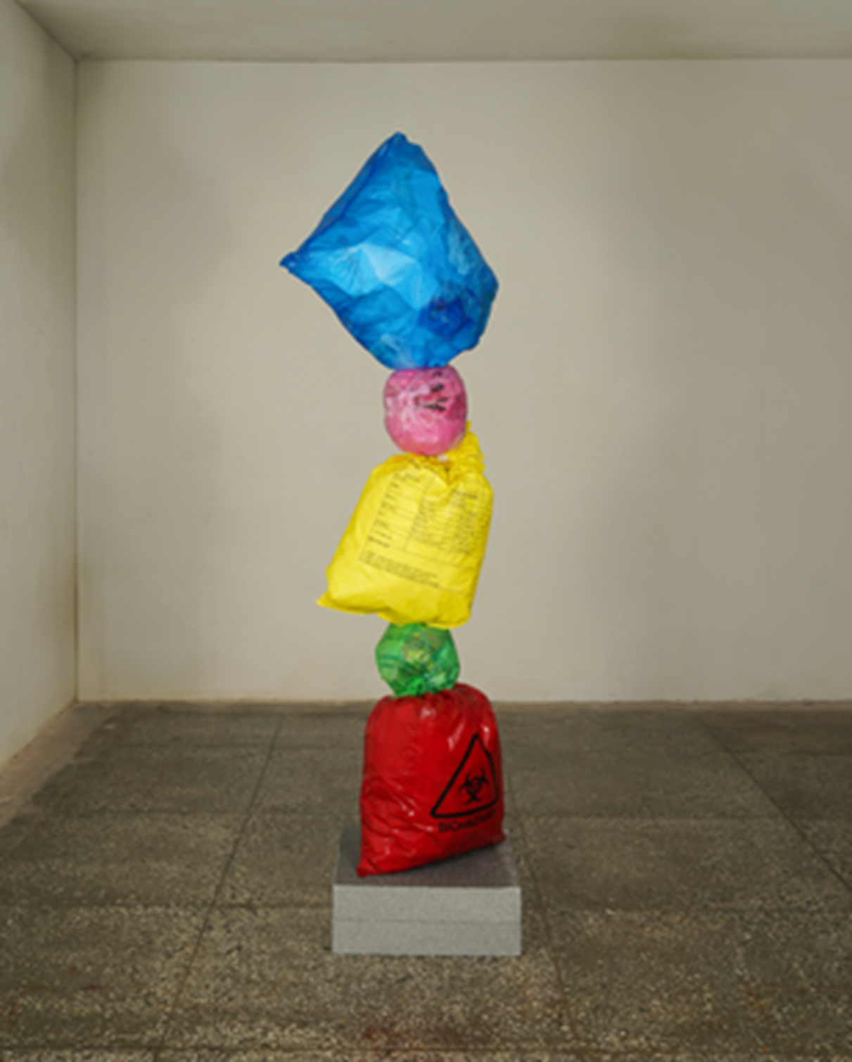 cardboard boxes, and paper, the artist conveys the structural contradictions of