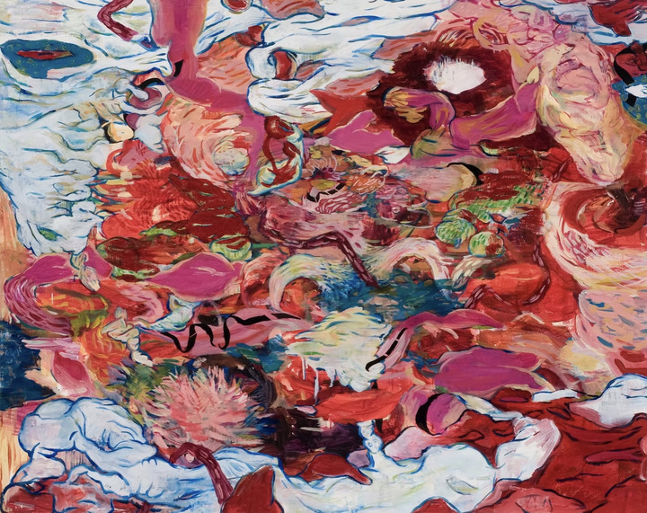 Her paintings, in which seemingly opposing elements—inside and outside, nature and the human—are thoroughly entangled and woven into rhythm, emanate a vivid sense of life in and of themselves, leading the viewer into a deeper, more abyssal realm beyond the time and space of the real world.