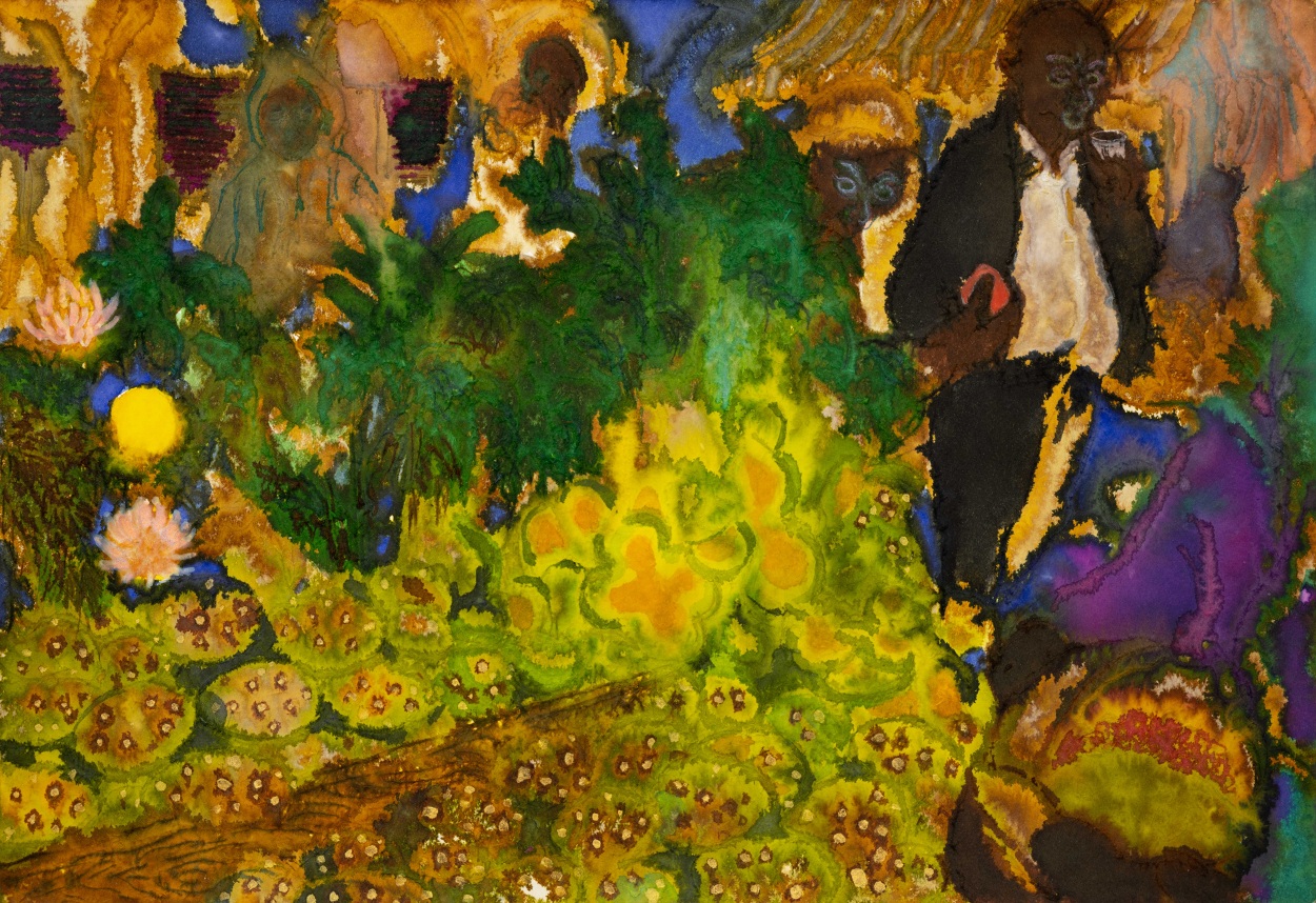 Highlighter, ink, watercolor and wine on paper