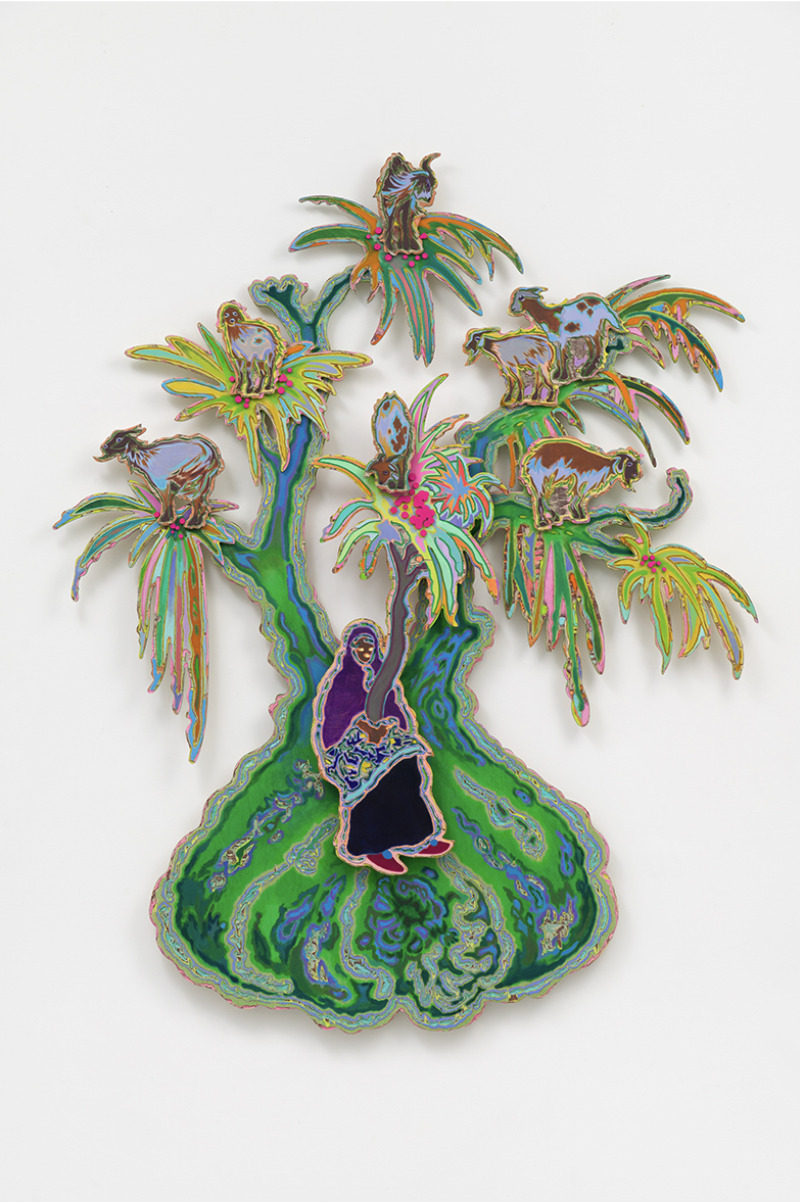 Ink, screenprint, woodburning, woodcut and oil paint on Birchwood