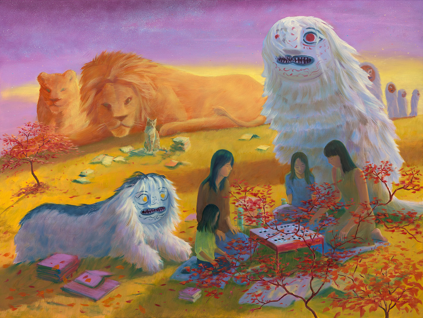 Light is a central formal element in her paintings. In Sun Moon Tea(2024), day and night coexist within one composition; in Moon Ritual(2024), a ceremonial scene unfolds beneath a full moon. In Dear Storm, a soft light envelops figures and animals, regulating the rhythm of viewing. Light does not function merely as illumination, but as a device that modulates emotional temperature and the density of the scene.