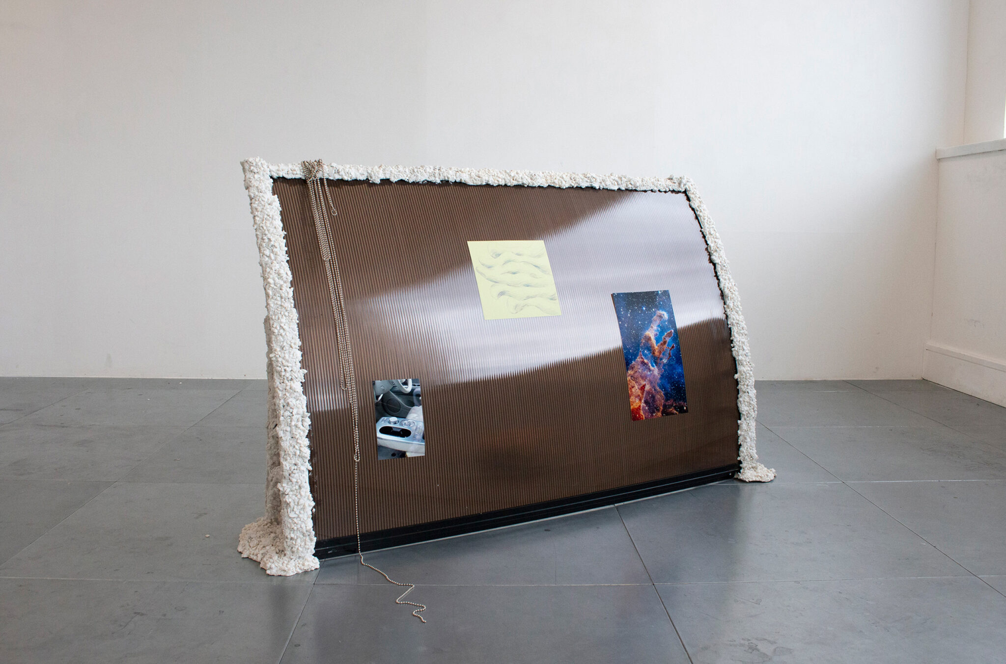 Kyungmin Sophia Son’s practice begins with a reconsideration of the position of the human within the conditions shaped by technological development and the post-Anthropocene world. Based in London, she explores transhumanism, interspecies relationships, and interactions with non-human entities, proposing a perspective that moves beyond anthropocentric frameworks of understanding. As seen from Believe me / Life Attitude(2017), she juxtaposes industrial materials and everyday objects to construct a line of inquiry that blurs the boundaries between humans and matter, life and non-life.