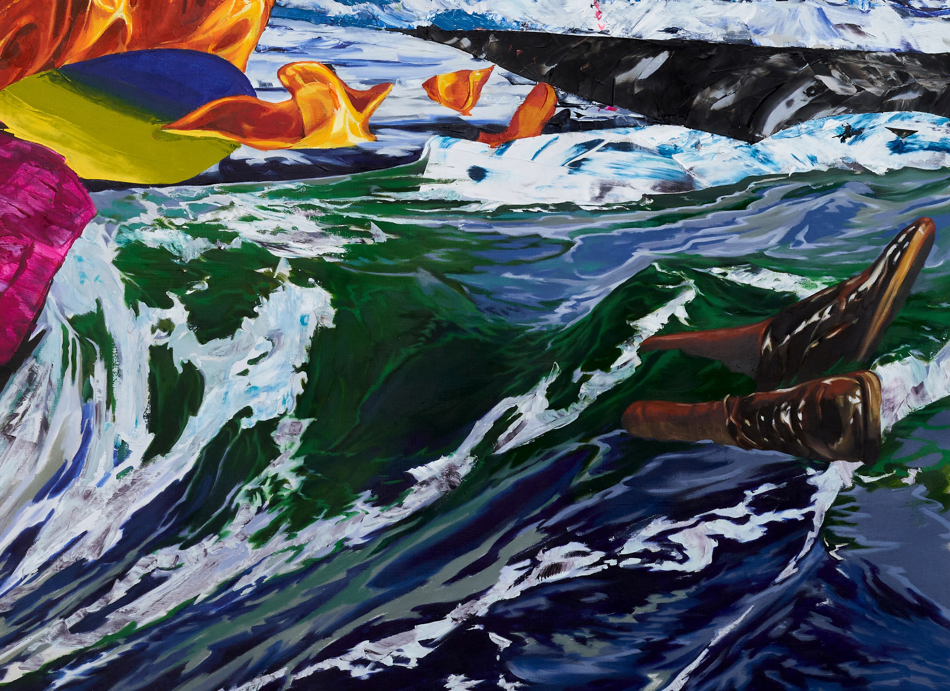 The cephalopod, with its many limbs, signifies the desire to possess multiple abilities. The theatrical actor, who expresses another person’s life and desire through human emotions—joy, anger, sorrow, and pleasure—functions as a proxy for human desire. The gap and the flames between the circular, graphic-like image and the collaged image of the sea symbolize a moment of change, a moment of ‘becoming’.