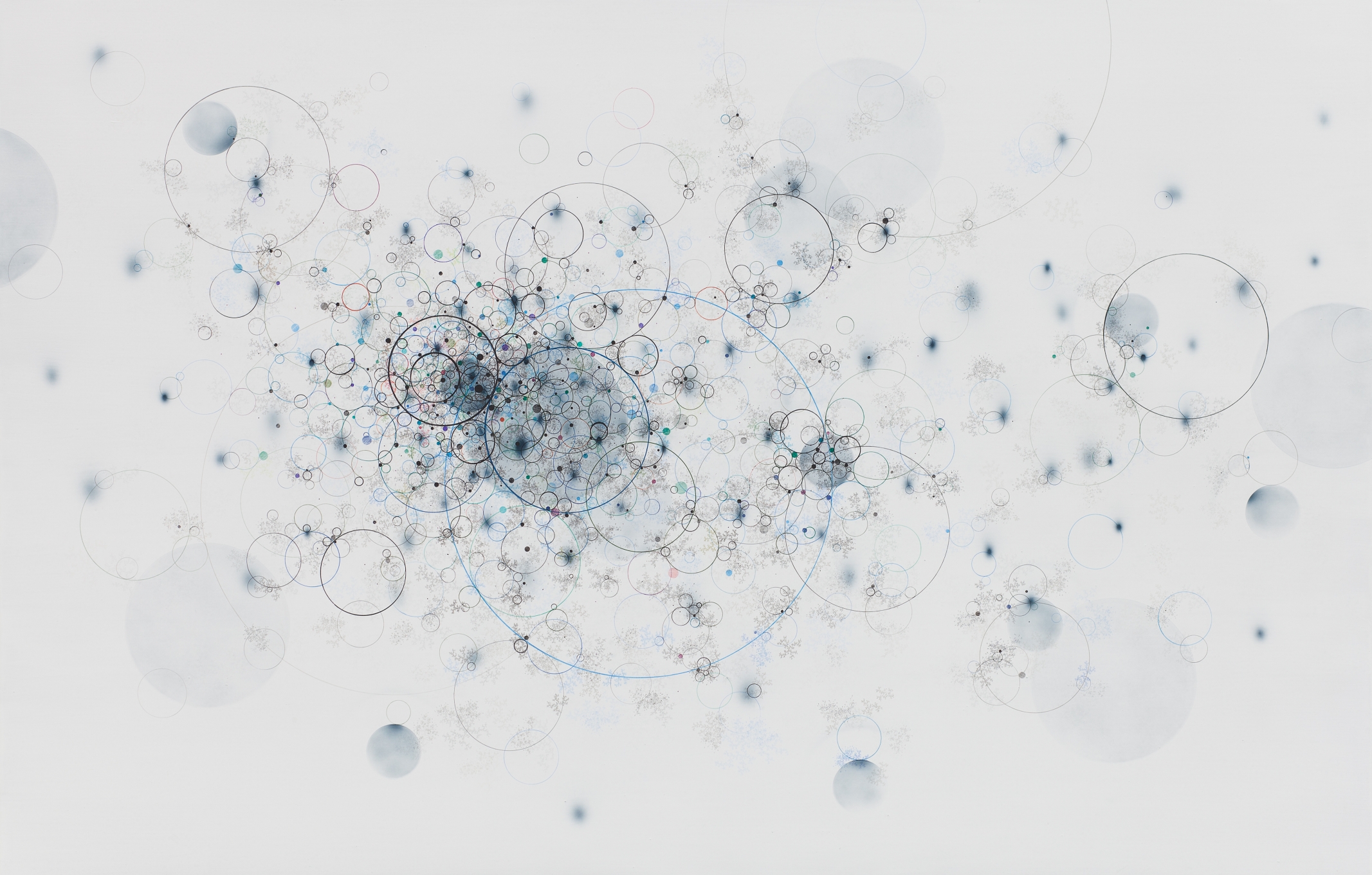However, there is a decidedly distinctive approach to the images in Lee’s recent paintings, which is the amalgamation, or synthesis, of opposites, rather than their simple dualism. Whilst his previous paintings emphasised the paradoxical resemblance of the microscopic world and cosmic space, Lee’s recent paintings seem to explore a kind of universal order innate in these opposite worlds, allowing controlled yet self-generating patterns and forms to extend what the artist has started with the initial composition.
