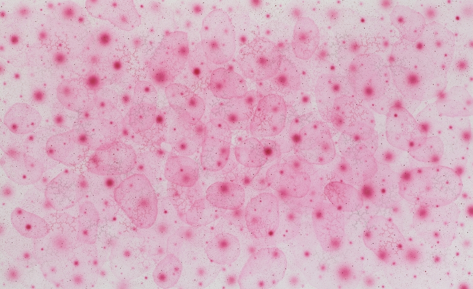 However, there is a decidedly distinctive approach to the images in Lee’s recent paintings, which is the amalgamation, or synthesis, of opposites, rather than their simple dualism. Whilst his previous paintings emphasised the paradoxical resemblance of the microscopic world and cosmic space, Lee’s recent paintings seem to explore a kind of universal order innate in these opposite worlds, allowing controlled yet self-generating patterns and forms to extend what the artist has started with the initial composition.