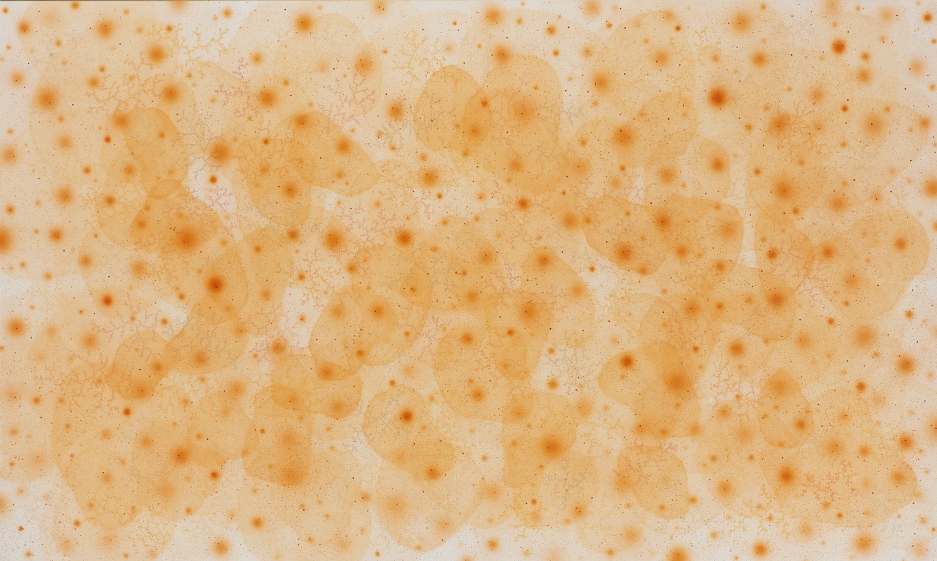 However, there is a decidedly distinctive approach to the images in Lee’s recent paintings, which is the amalgamation, or synthesis, of opposites, rather than their simple dualism. Whilst his previous paintings emphasised the paradoxical resemblance of the microscopic world and cosmic space, Lee’s recent paintings seem to explore a kind of universal order innate in these opposite worlds, allowing controlled yet self-generating patterns and forms to extend what the artist has started with the initial composition.