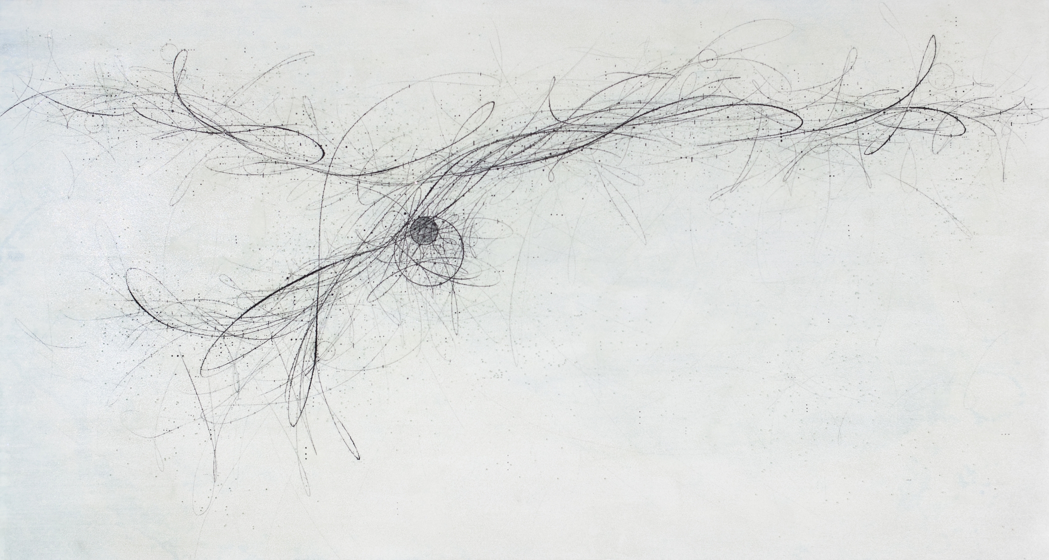 Looking at Lee Kang Wook's work, delicately drawn lines and pale coloured patches are floating on the surface of paintings. Oval and rectangular forms are emerging in different sizes and at times are incomplete, just suggestive enough of these forms, and at other times overlapping each other as if repeating itself in spatial successions. In another group of his paintings, grain-like tiny ovals are multiplying in seemingly infinite numbers, resembling the fractal growth of natural forms, which are at once abstract and organic.