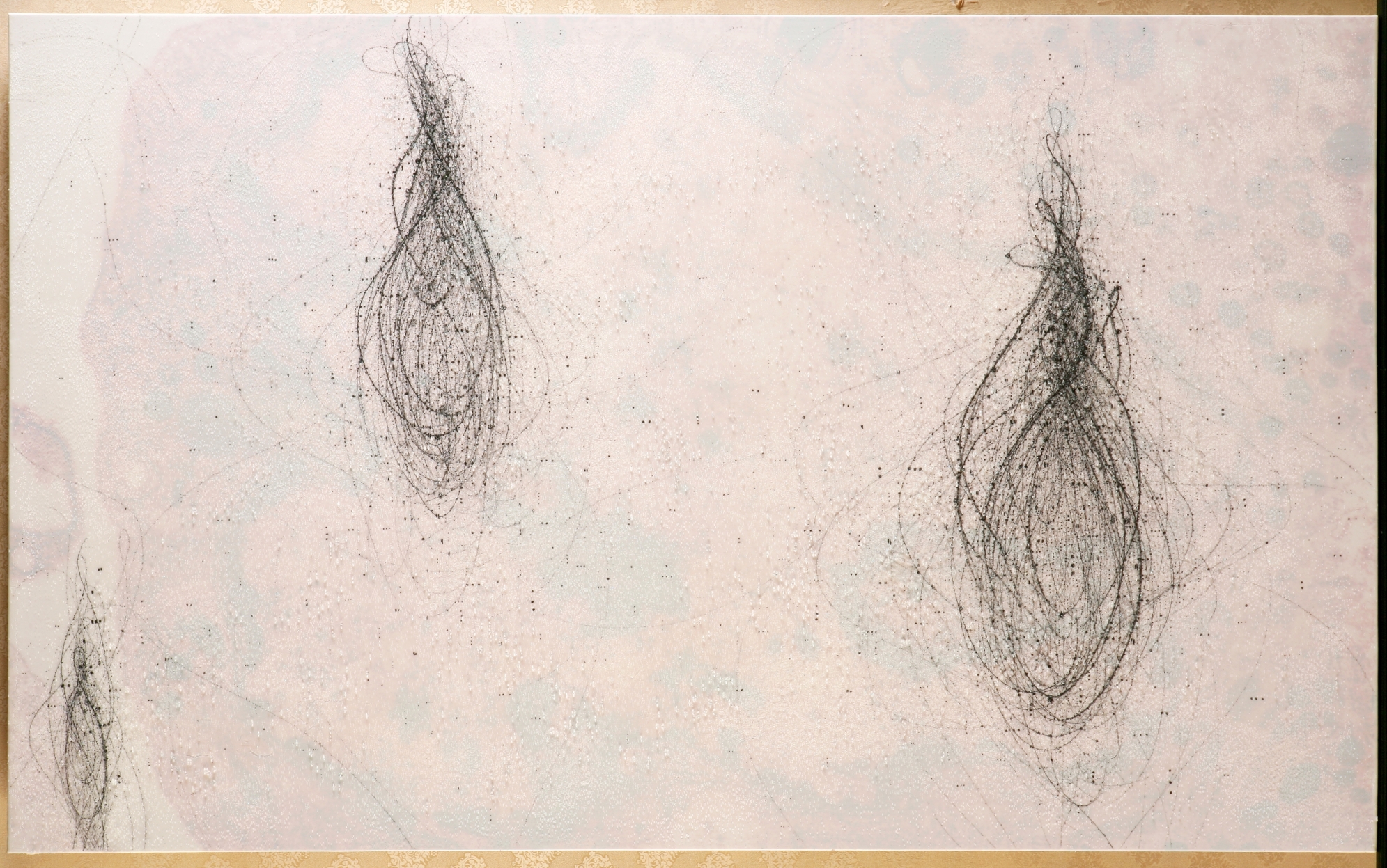 Looking at Lee Kang Wook's work, delicately drawn lines and pale coloured patches are floating on the surface of paintings. Oval and rectangular forms are emerging in different sizes and at times are incomplete, just suggestive enough of these forms, and at other times overlapping each other as if repeating itself in spatial successions. In another group of his paintings, grain-like tiny ovals are multiplying in seemingly infinite numbers, resembling the fractal growth of natural forms, which are at once abstract and organic.