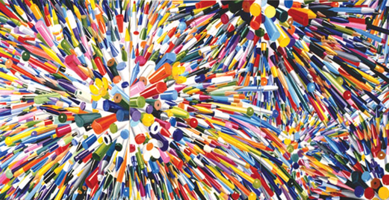 Hong Kyoungtack has explored the theme of obsessive desires in modern life through everyday materials such as pens, pencils, and books. Additionally, he has opened up new possibilities in painting by traversing between design and painting, blending pop art and realism, while also achieving a universality that resonates with people. Since the 1990s, Hong has experimented with his own unique style, influenced by pop art, geometric abstraction, and color-field painting, incorporating bold primary colors, contrasts in color, and rhythmic compositions.
