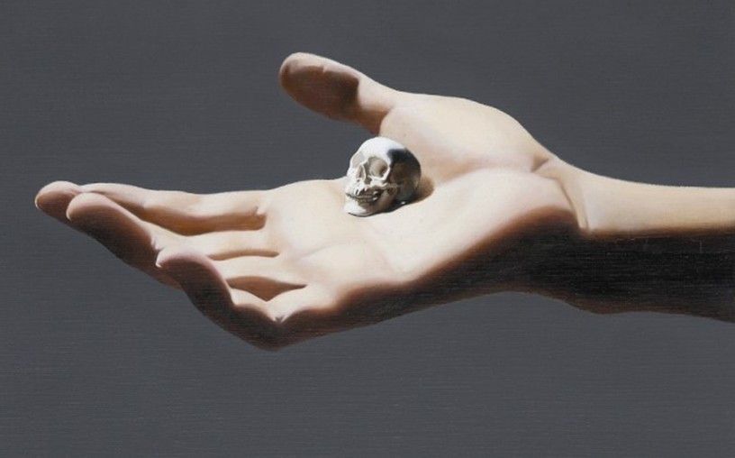 The giant hand in the works symbolizes the hand of an absolute being, one that no one has ever actually seen. This hand reaches toward fragile symbols, such as a butterfly representing delicate existence, or a skull symbolizing death. Hong explained, 'I wanted to portray the hand of an absolute being. The absolute we know exists at the boundary between good and evil.'