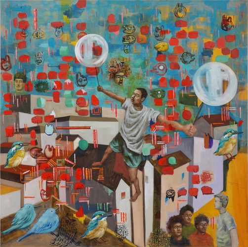 The organic arrangement, heterogeneous motifs, and the repetitively deconstructed figures are illustrated in visual features basis on the artist’s work. There are no distinct personalities of the characters and there is no story between them.